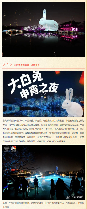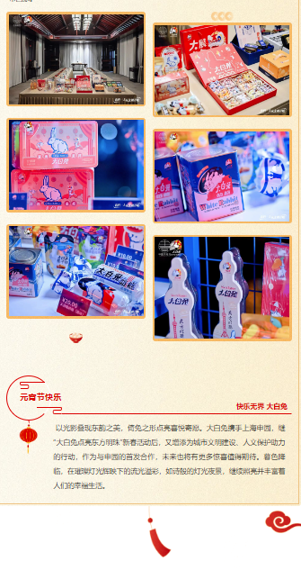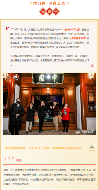 2023年2月4日,大白兔與上海申園聯(lián)合呈現(xiàn)——“大白兔·申宵之夜”主題活動,帶來東方文化與現(xiàn)代潮流相融的沉浸式光影秀體驗(yàn),用快樂點(diǎn)亮申園、點(diǎn)亮人文情懷。堅(jiān)持以品牌思維賦能企業(yè)高質(zhì)量發(fā)展,深耕“大白兔快樂分享”的品牌理念,踐行“新的一天從光明開始”的企業(yè)使命,大白兔旨在借此合作,彰顯保護(hù)自然的理念,賦能城市精神文明建設(shè),深化老字號品牌的活力。